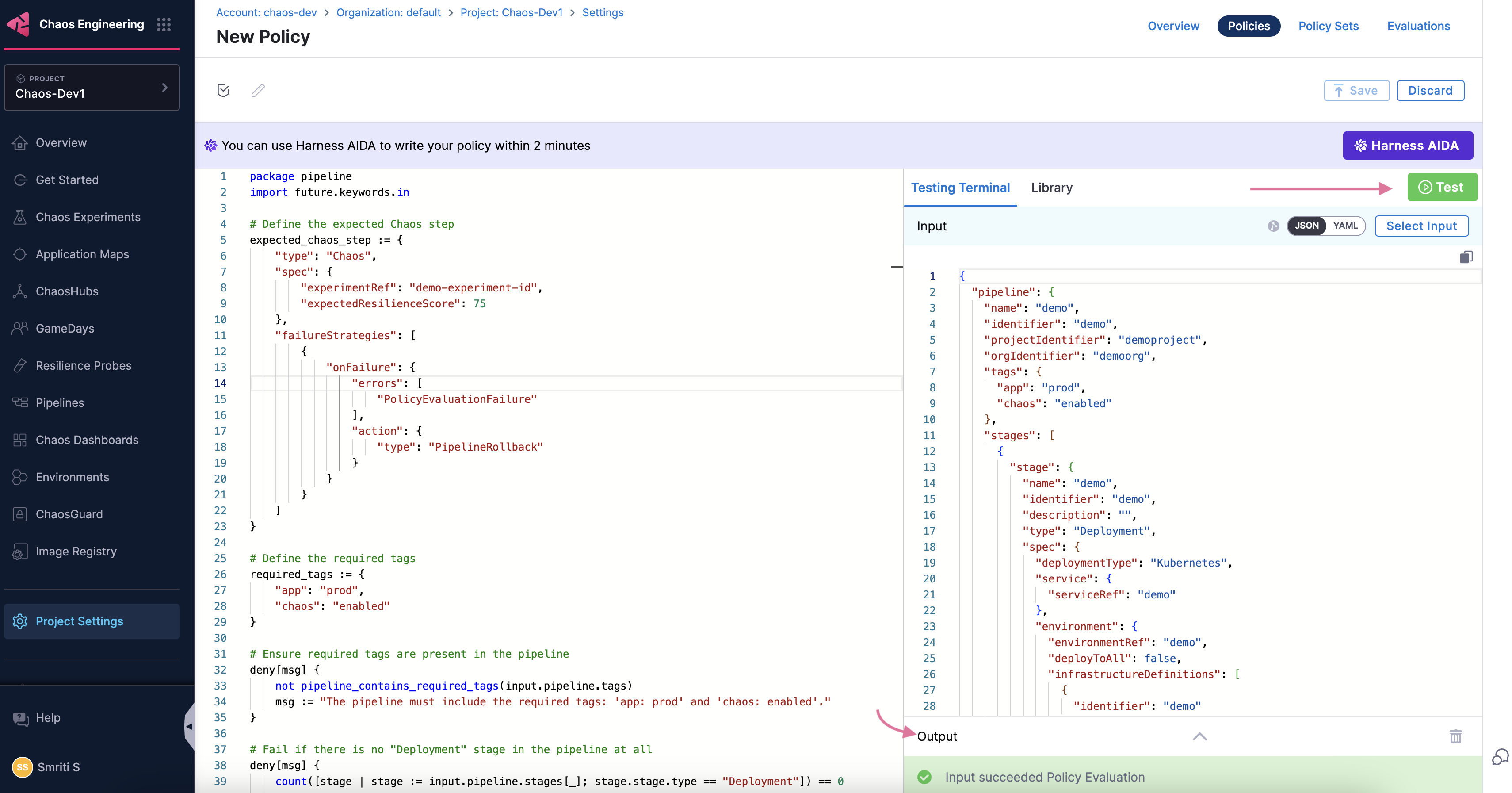 To apply an OPA policy to your pipeline, go to Chaos module -> Project Settings. Under Security and Governance, select Policies.