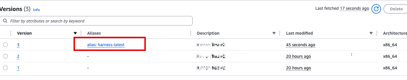 Harness uses Lambda function aliases to support rollback workflows. During deployment, Harness creates or updates an alias to point to the latest function version. If a rollback is triggered, the alias is redirected to the previously deployed version—restoring the last known good state.