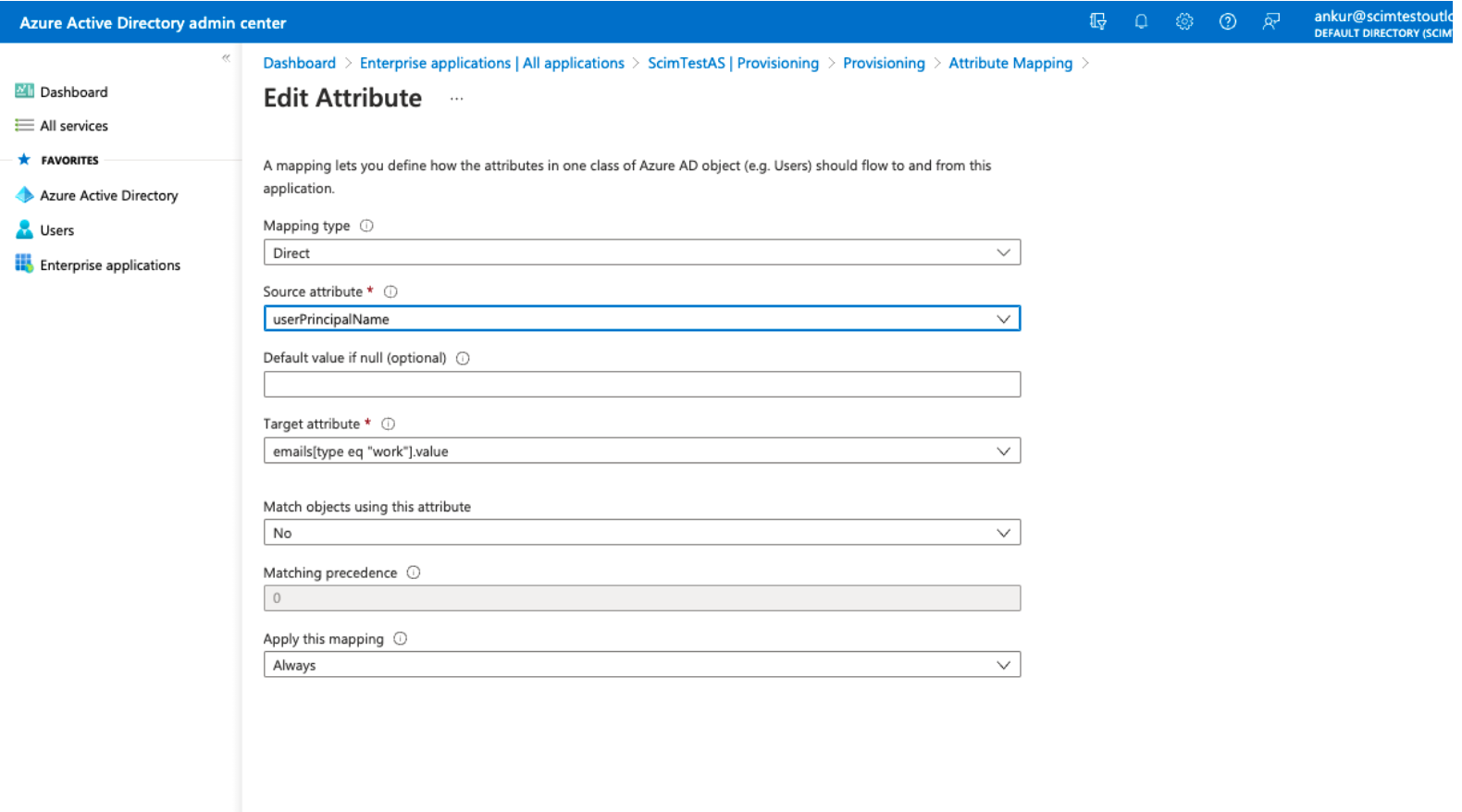 . The target attribute remains asemails[type eq “work”].value