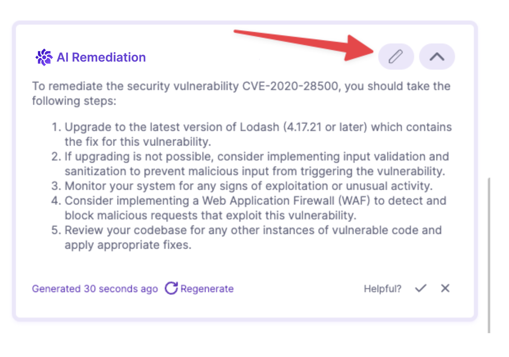 • Before you implement an AI-generated suggestion, consider carefully the reliability and extent of the publicly-known information about the detected issue. The accuracy, reliability, and completeness of a suggestion depend on the public knowledge about that issue. An AI-generated suggestion is not guaranteed to remediate the issue and could introduce other issues.