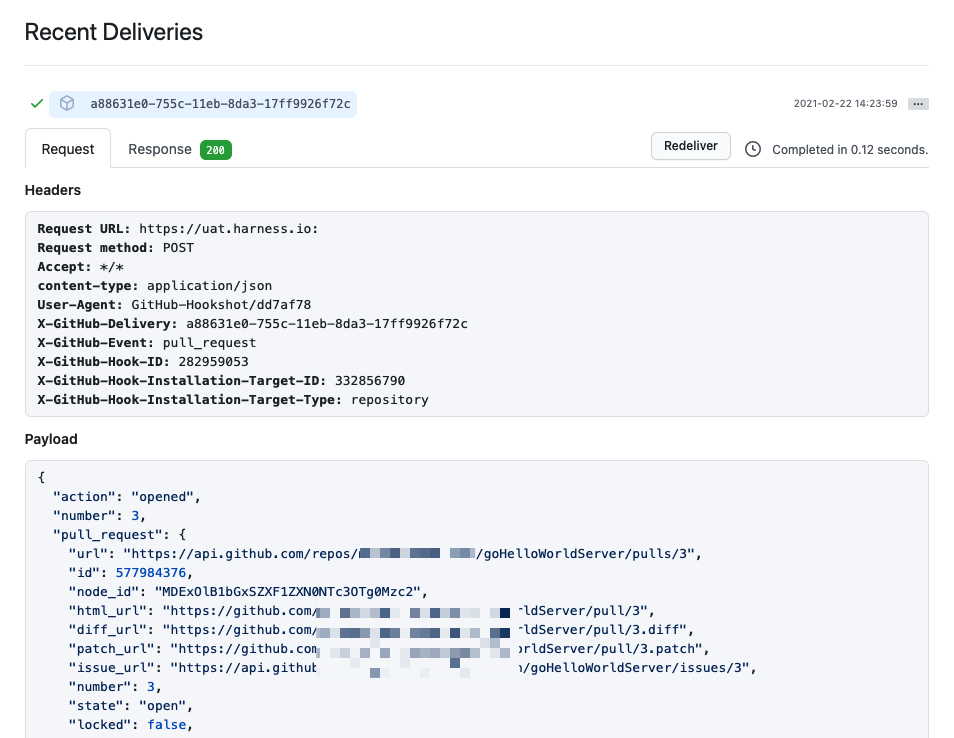 - Check the payloads sent from the Git provider and compare the relevant fields with your trigger conditions. For example, in GitHub you can view the full payload of each event sent from a specific webhook.