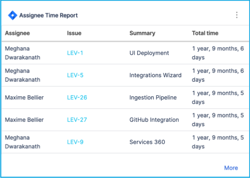 - Issue Assignee Time Report: A table of issues that have sat with the same assignee for the longest amount of time.